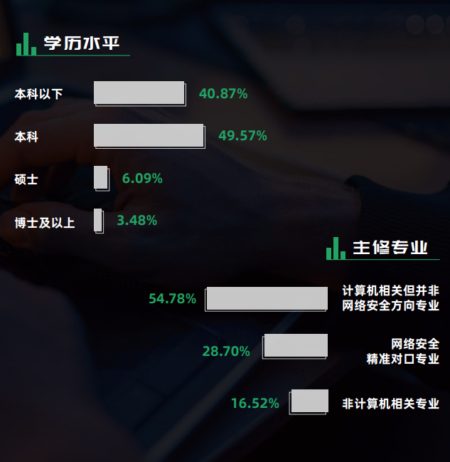 2. 国内高学历、受过系统性培训的白帽人才仍较为稀缺。本科以下学历的白帽子达到4成,专业精准对口网络安全领域的白帽子占比不到3成。